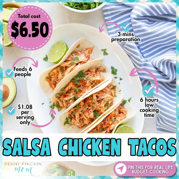 This is what works when you forgot to plan dinner again. Three ingredients – chicken breasts, a jar of salsa, and a packet of taco seasoning. That’s it. Four hours on high and the chicken shreds with a fork while the kitchen smells like a taco shop. Total cost: $6.50 | Cost per serving: $1.08 | Prep: 3 minutes | Cook: 4 hours high/6 hours low | Serves 6 | Budget win: One jar of salsa does all the work of multiple ingredients. Use corn tortillas from Aldi ($1.29) to keep it under budget. My kids pile theirs with cheese and sour cream, but it’s good plain too.