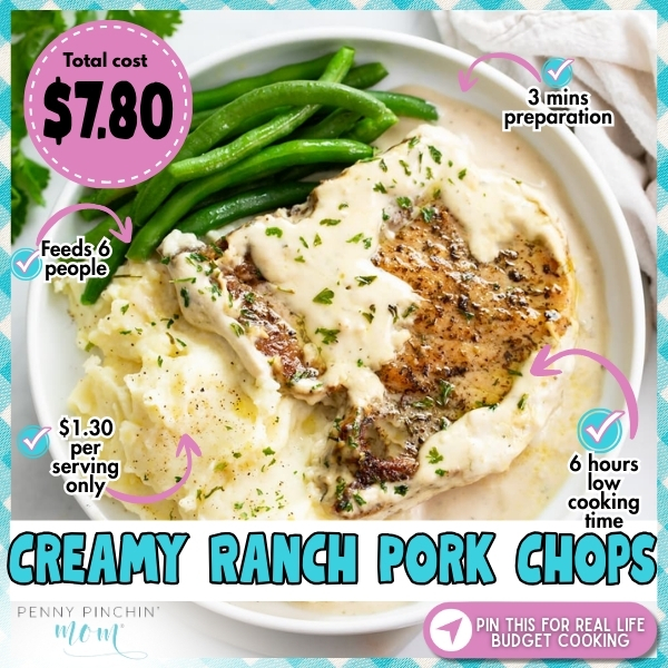 Your family won’t believe this costs under eight bucks. Four pork chops (the thin bone-in ones from Walmart), a can of cream of chicken soup, a packet of ranch seasoning, and half a cup of water. The pork gets so tender it falls off the bone, and that sauce over rice or egg noodles makes everyone go quiet while they eat. Total cost: $7.80 | Cost per serving: $1.30 | Prep: 3 minutes | Cook: 6 hours low | Serves 6 | Budget win: Bone-in chops cost $1.50 less per pound and taste better. Add frozen green beans in the last hour for a complete meal.