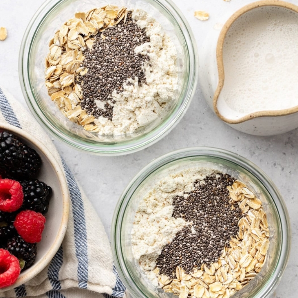 Combine ½ cup old-fashioned oats with 1 tablespoon chia seeds, ¾ cup unsweetened almond milk, and a dash of vanilla extract in a mason jar. Oats: $4 for a container that makes 20 servings, chia seeds around $6 for a bag that lasts months, and almond milk, maybe $3. Each serving runs under $1. The chia seeds add 5g fiber and slow digestion, so blood sugar stays steady. Prep time is 2 minutes the night before, zero minutes in the morning. Serves one hungry person or two light eaters. Stir in a handful of blueberries or a spoonful of natural peanut butter when you’re ready to eat it.