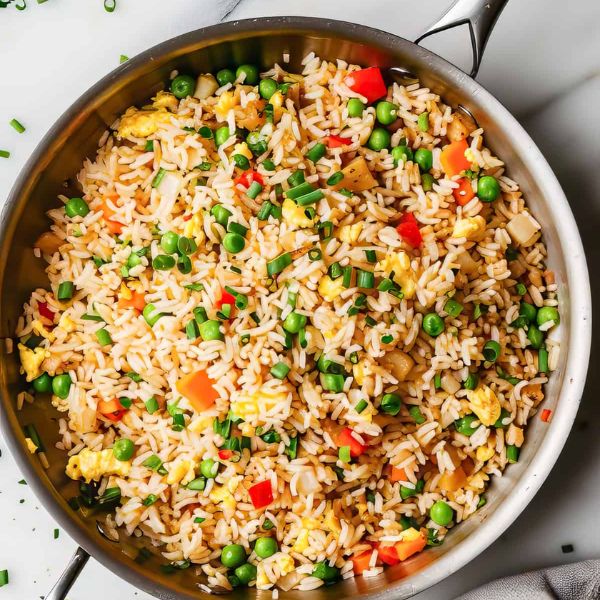 Scramble a few eggs in a hot skillet, push them aside, and toss in leftover rice with a bag of frozen stir-fry vegetables and soy sauce. Everything together costs under $6 and takes 10 minutes start to finish. Day-old rice from the fridge works best (about $1.50 worth), eggs typically sell for around $4-5/dozen these days, and frozen vegetables are about $2-3/bag. Four servings for barely any money or effort. This works with any vegetables you have, and adding a splash of sesame oil makes it taste like takeout.