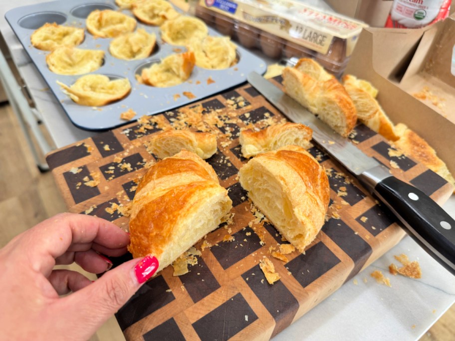- If your croissants are extra large, you may be able to get three egg cups out of one. Don’t overthink the first step, just cut them to fit your muffin tin. You could instead make them larger and use a 6-slotted muffin pan!