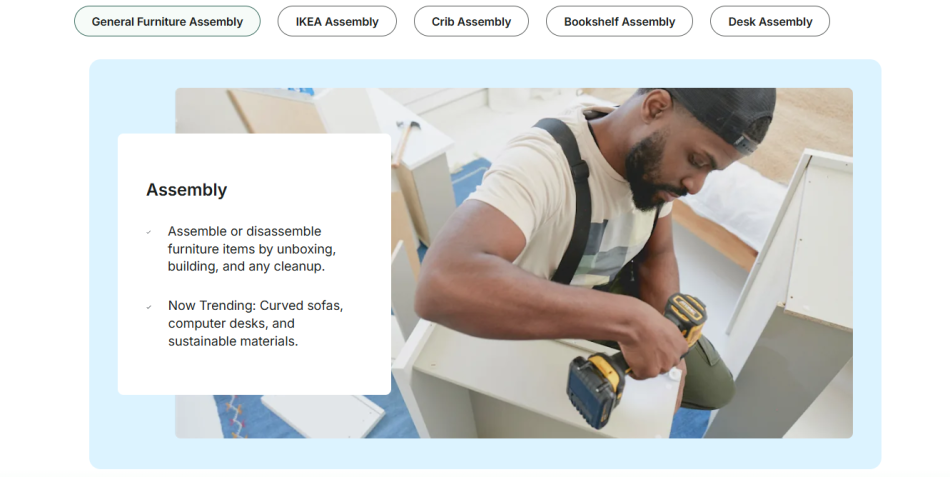 TaskRabbit works more like a gig marketplace than a traditional cleaning company. Instead of booking a set cleaning package, you hire individual “Taskers” who offer services ranging from cleaning to furniture assembly.
