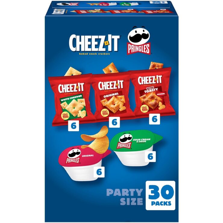 - Party size variety pack includes Cheez-It Original, Cheez-It White Cheddar, Cheez-It Extra Toasty, Pringles Original, and Pringles Sour Cream and Onion