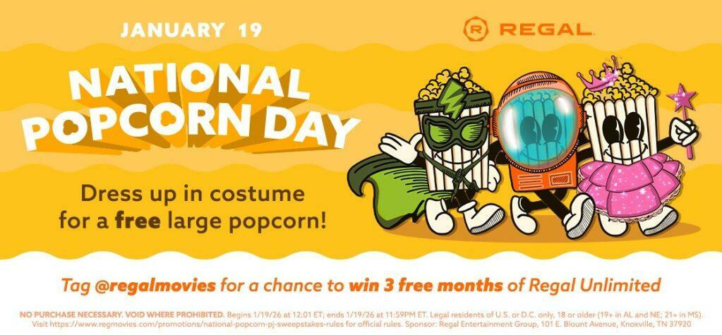 Free Large Pizza at Regal Cinemas – Put on a costume and head to your local Regal Cinema on January 19 to get a free large popcorn.
