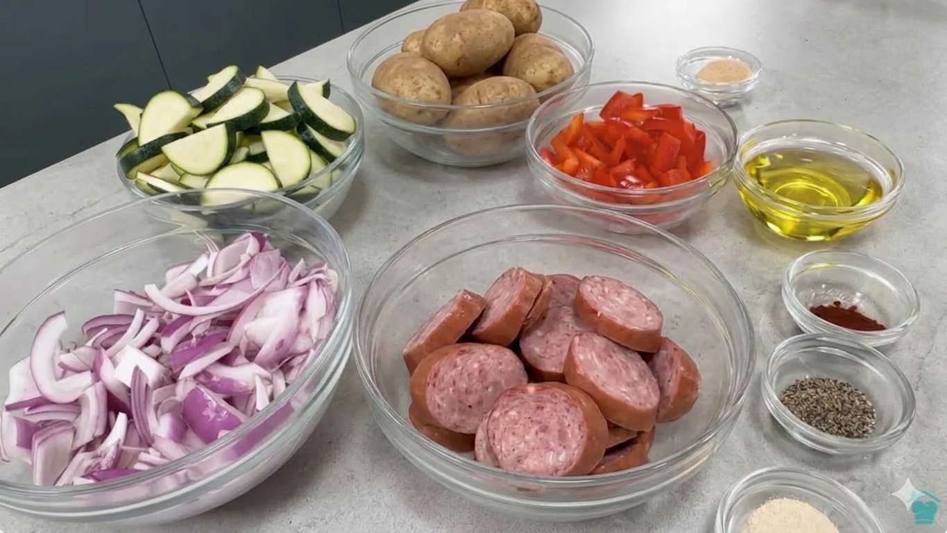 Combine and Season: In a large mixing bowl, combine the chopped potatoes, sliced zucchini, red bell pepper, and sausage. Drizzle with 2–3 tablespoons of olive oil. Add your seasonings: garlic powder, oregano, salt, and black pepper. Use your hands to toss everything together thoroughly, ensuring every piece is evenly coated in oil and spices.