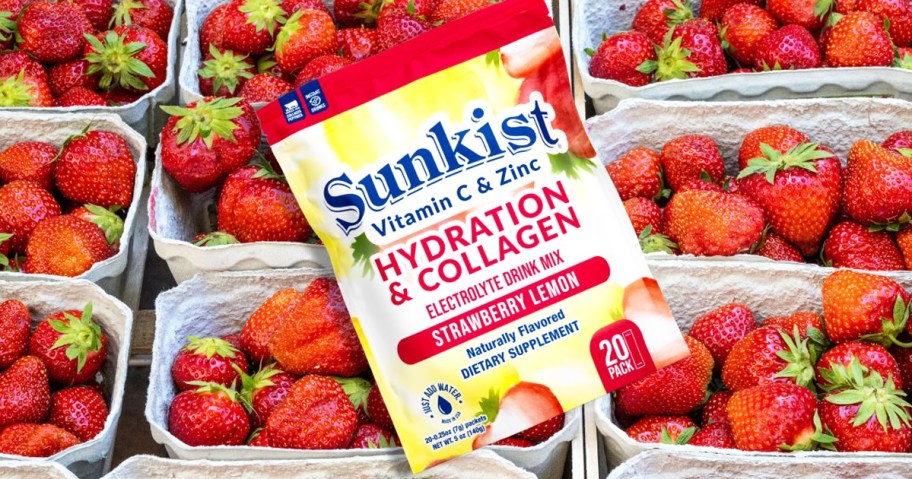 Pop over to Amazon where you can grab this Sunkist Collagen + Hydration Strawberry Lemon Electrolyte Drink Mix 20-Pack for just $13.65 shipped or less (regularly $27.99) when you clip the digital coupon and opt to Subscribe & Save!