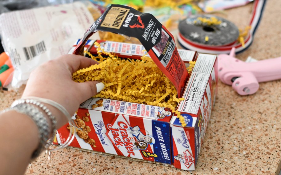 I could see my daughter making some for her friends too! This idea could be a cute, small yet thoughtful gift for nieces, nephews, grandkids, etc. The Cracker Jack could be fun for a baseball fan, and in addition to boxes of Cracker Jacks, you could add some sunflower seeds, gum, and maybe a baseball.